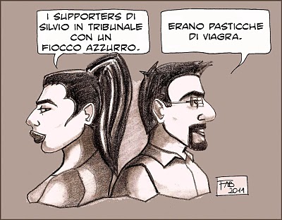 Il mio stato d’animo è di assoluto sconcerto,delusione,impotenza di fronte all’arroganza,alla tracotanza mediatica di questa persona,questo esemplare di suino “arcorino ” fatto persona,che continua,alla vigilia della rappresentazione pubblica delle sue “porcherie” ,a comportarsi come se nulla fosse accaduto,come se nessun soldo fosse stato versato a quelle povere disgraziate (ma io direi sopratutto furbe…)frequentatrici di Villa S.Martino.Ed ha ancora il coraggio,la spudoratezza,perchè non può esservi compassione di fronte a tante vittime della guerra libica,di dire “Sono profondamente addolorato e mi dispiace per Gheddafi”…